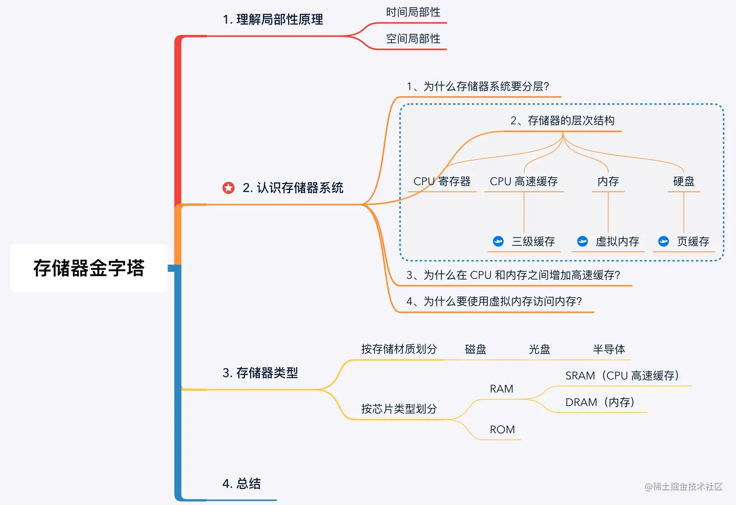 在现代计算机系统中,一般采用 “CPU 寄存器 - CPU 高速缓存 - 内存 - 硬盘” 四级存储器结构。自上而下容量逐渐增大,速度逐渐减慢,单位价格也逐渐降低。