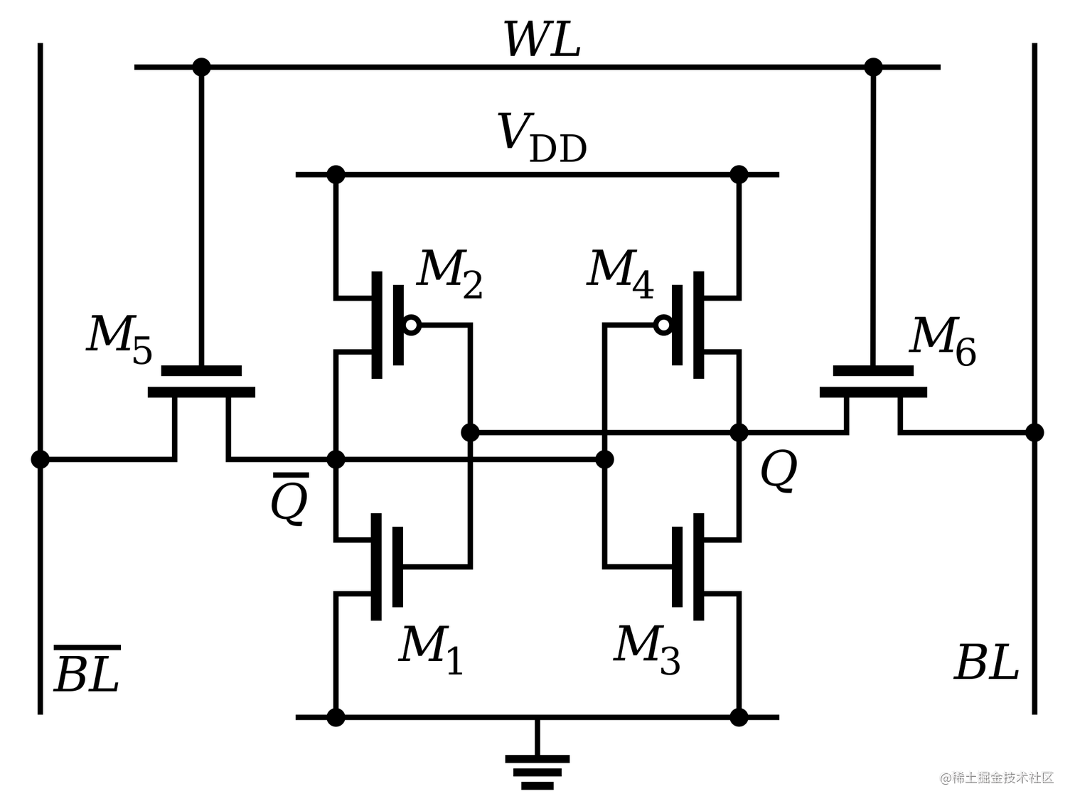 6 个晶体管组成的 1 比特 SRAM