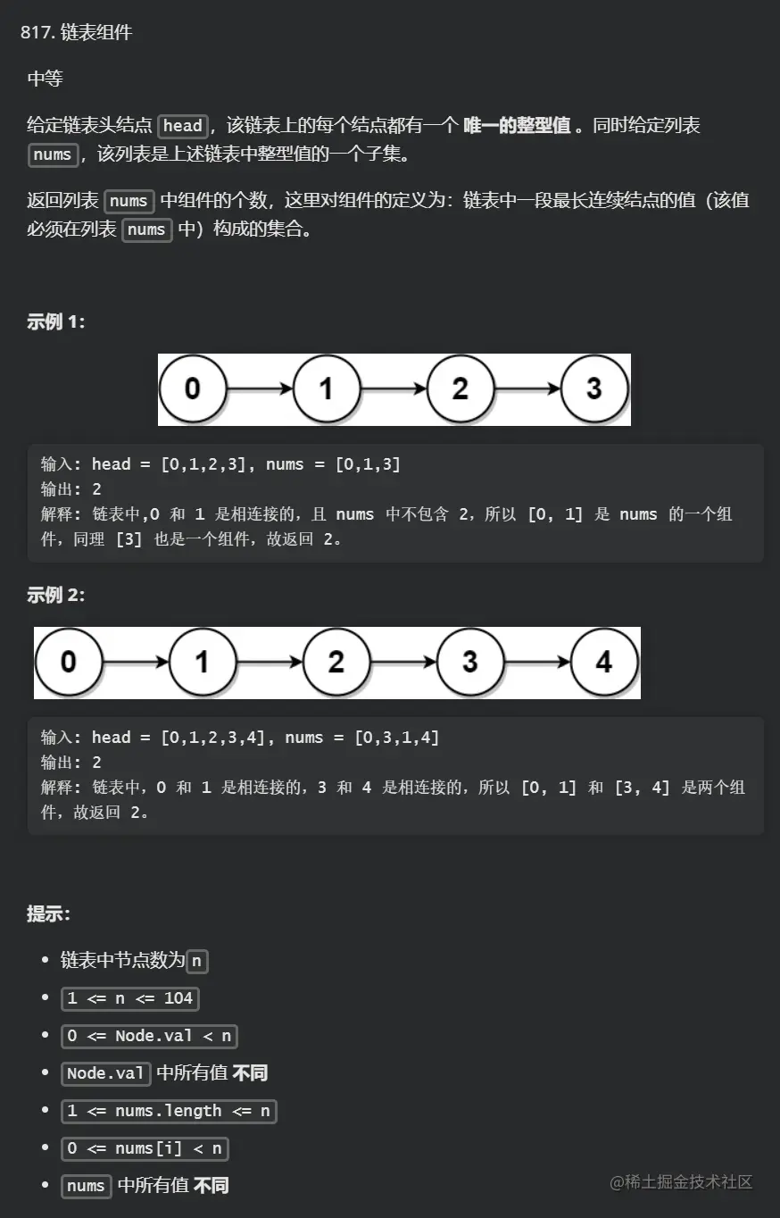 这是 力扣上的 817. 链表组件,难度为 中等。