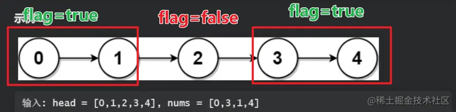 做本题需要擦亮眼睛,题目给出了一个链表,里面的每一个节点对应的数字都是唯一的,还给出了一个 nums 数组,内容是链表的子集,那么也说明 nums 中的数据每一个数字也是唯一的
