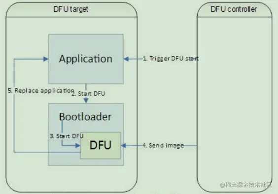 bootloader 是引导加载程序,DFU的基本流程就是在 bootloader中接收新固件数据并写入Flash,接收完毕后重启跳转并运行新固件 。其中SDK v11及更早版本中bootloader为开放透明性的Legacy DFU,而SDK v12之后有了加密性的Secure DFU。