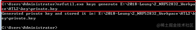 在D盘新建一个文件夹,命名为key,在cmd命令中输入以下内容:nrfutil.exe keys generate D:\key\private.key指令,生成私钥文件private.key