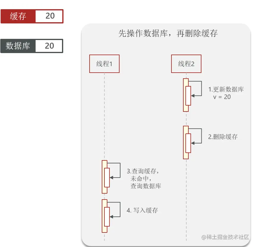 可以看到,先操作数据库再删除缓存出现数据不一致的可能性还存在
