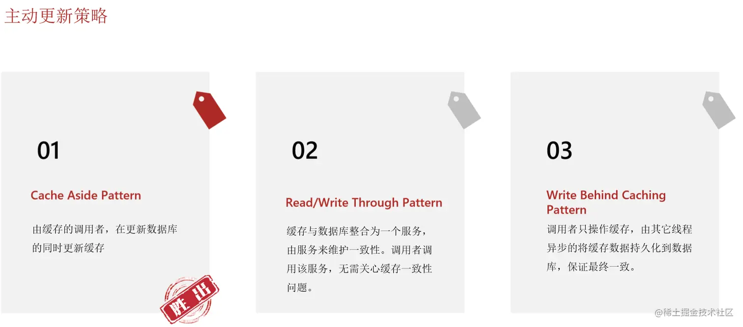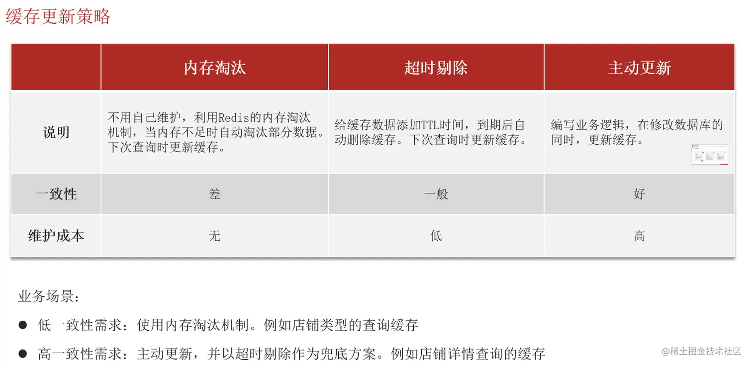 - 高一致性需求:主动更新,并以超时剔除作为兜底方案