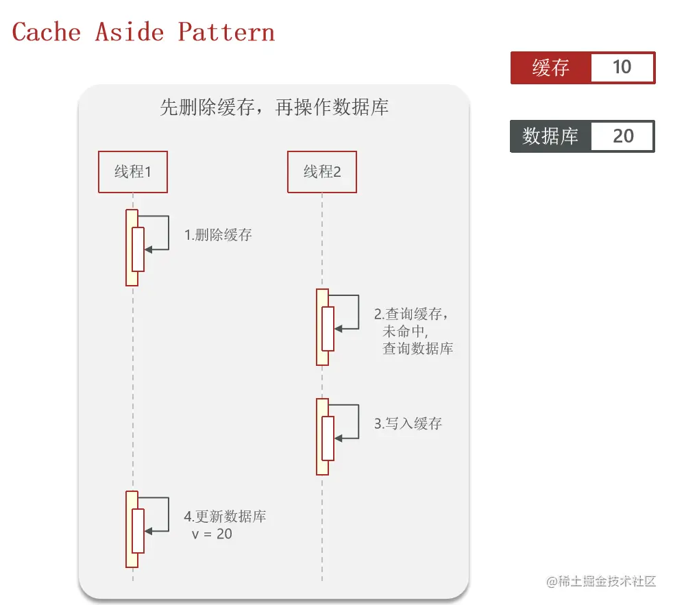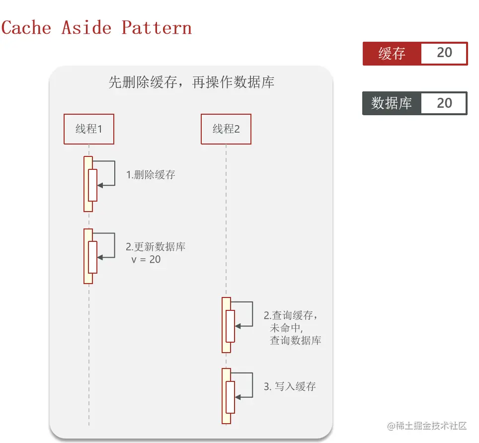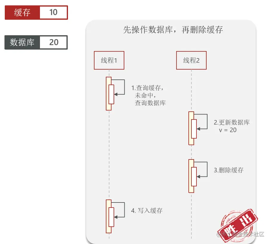 - 线程1查完数据库进行写缓存的微秒时刻线程2更新数据库,删缓存 在这微小时刻进行数据库的写入(耗时长)可能性不大,所以选择先操作数据库,再删除缓存。