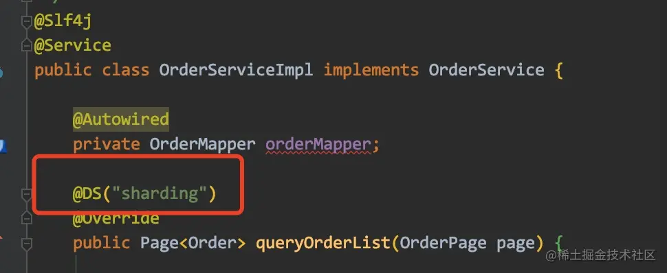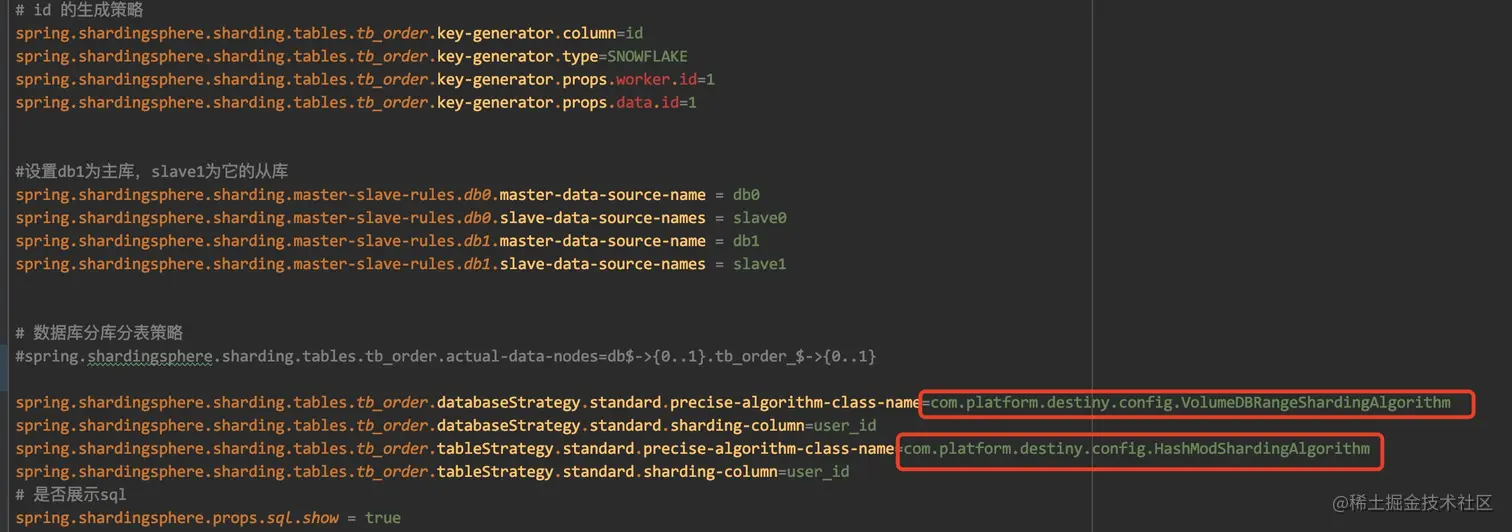 此外在图中展示的有具体的分库分表算法的配置,这里使用的是精确分片算法。