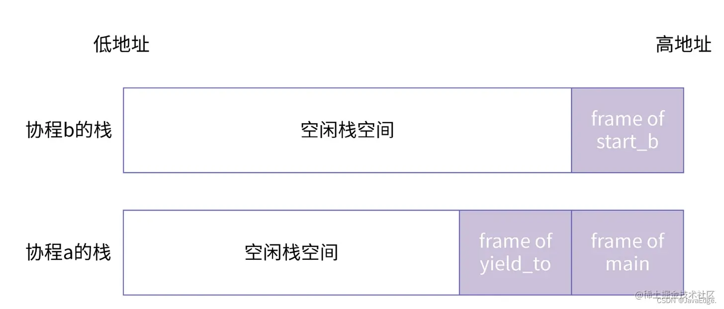 main函数执行过程中(即代码的57行),CPU通过执行yield_to方法转到另外一个协程。新的协程的入口函数是start_b,所以,CPU就转而去执行start_b,在start_b执行到48行的时候,还能再通过yield_to,再回到main函数中继续执行。