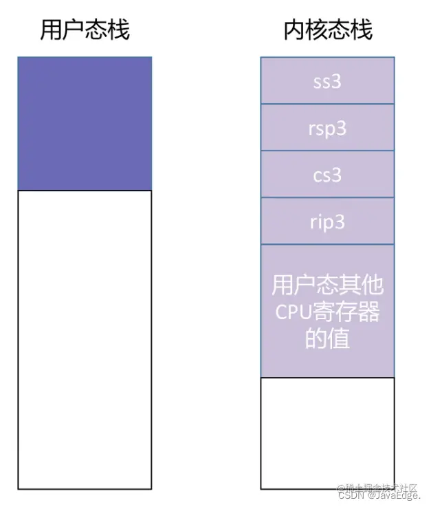 程序因call指令或int指令跳转时,只需把下一条指令的地址放到栈,供被调用者执行ret指令使用,这可便于返回到调用函数中继续执行。但图4内核态栈有点特殊,CPU自动将用户态栈的段选择子ss3,和栈顶指针rsp3都放到内核态栈。这里的数字3代表了CPU特权级,内核态是0,用户态是3。