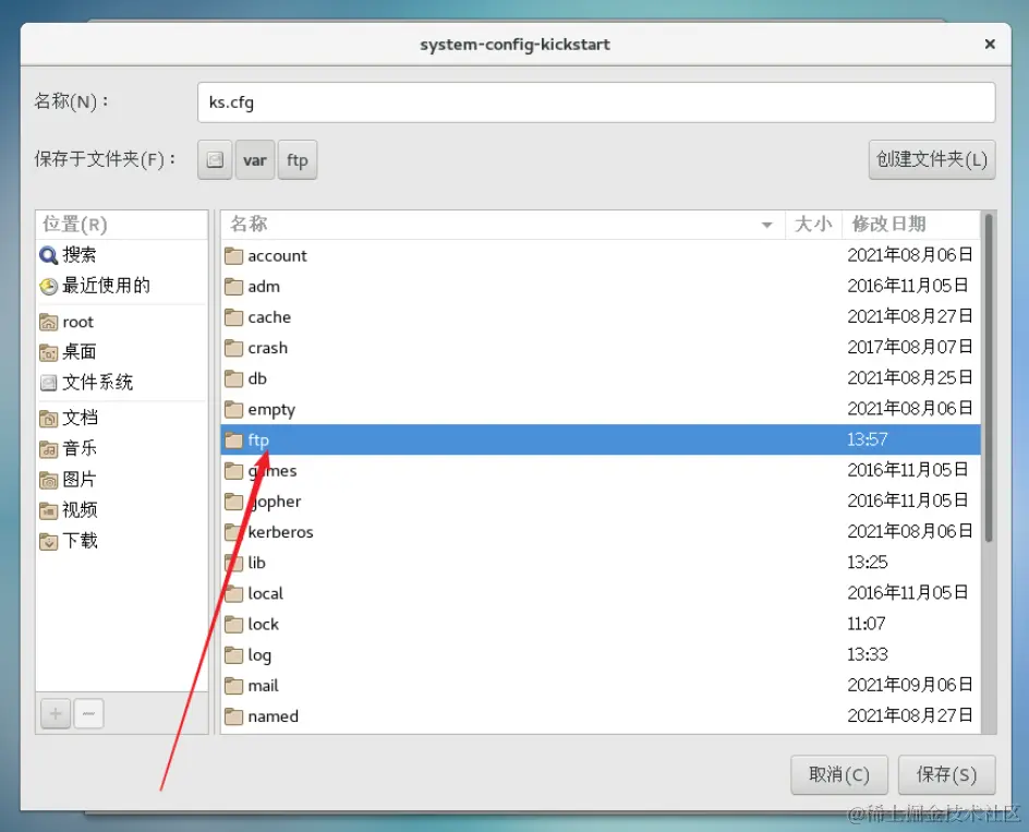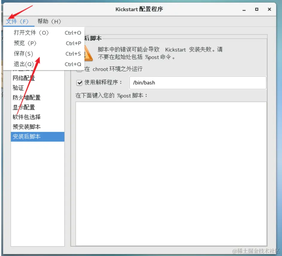 选择“Kickstart 配置程序“窗口的”文件”—————>>“保存命令”,选择指定保存位置,文件名为ks.cfg