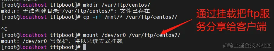 mount /dev/sr0 /var/ftp/centos7/ #将挂载的光盘内的文件全部挂载到centos7中