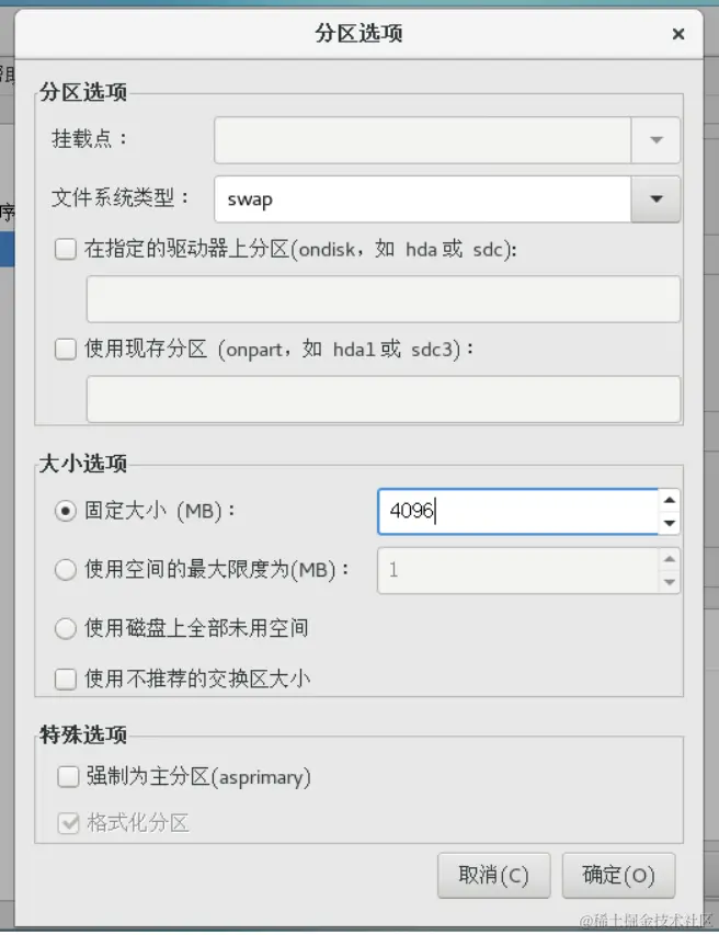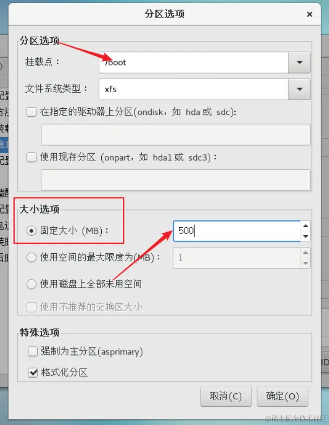 > 挂载点: /boot, 文件系统类型: xfs, 固定大小: 500M