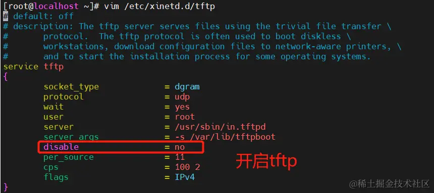 vim /etc/xinetd.d/tftp #修改TFTP服务的配置文件,如下: