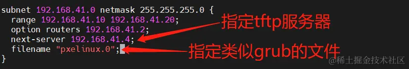 next-server 192.168.41.4; #指定TFTP服务器的地址