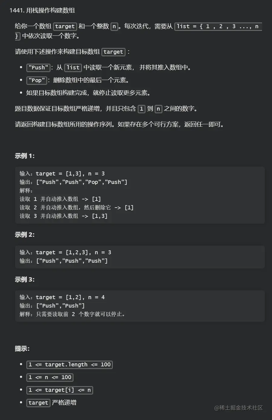 根据题意咱们需要去用栈的方式来处理这个题,题目给出的 target 是我们需要模拟的结果,给出的 n 实际上是对应这一个 1-n 的列表,并且此处说明 target 一定是单调递增的