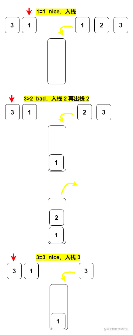 栈的思想是先进后出 FIFO,那么每个数字(来源于 1-n) 都需要遵循这个规定