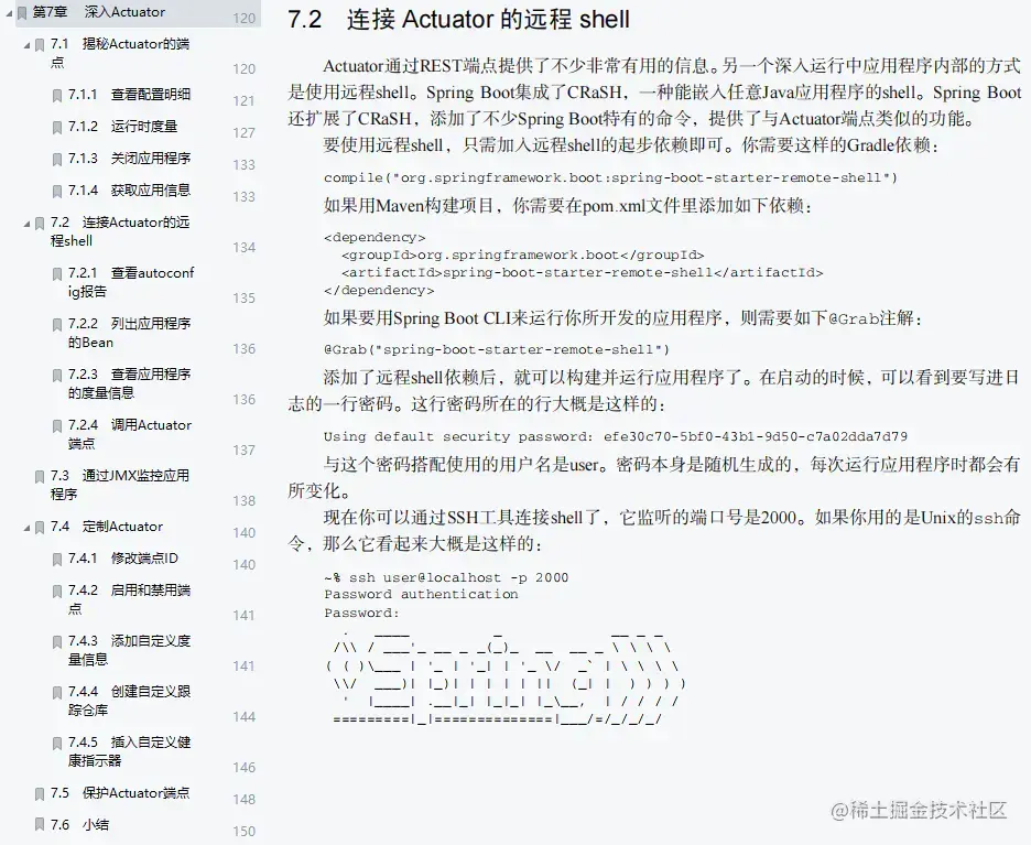 内容涵盖:(Actuator Web端点 + 调整Actuator + 通过shell连入运行中的应用程序 + 保护Actuator)