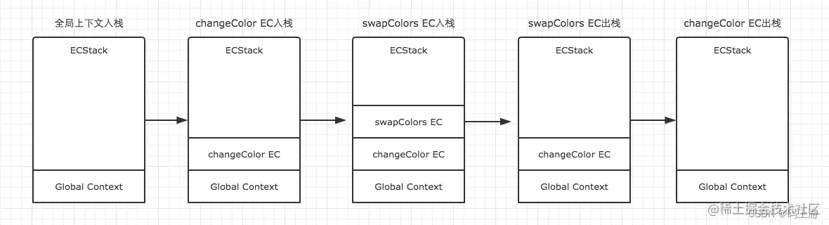 - 执行changeColor函数过程中,调用swapColors函数,同样地,swapColors函数执行之前也创建了一个swapColors的执行上下文,并压入到执行栈中。