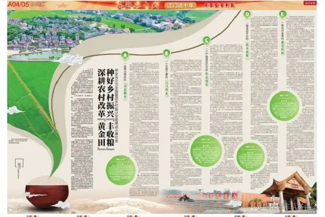 从守护粮食安全的“湾区粮仓”到全面小康的“江门样本”,从产值逾百亿元的农业园区到美丽乡村的“江门模板”,十年来,江门“三农”事业在乡村振兴战略推动下,高歌猛进:连续三年(2018—2020年)在全省推进乡村振兴战略实绩考核中被评为“优秀”等次,位居粤西片区第一;扶贫工作连续五年(2016—2020年)在全省考核中被评为“好”的最高等次;在2020年省粮食安全责任考核中获得全省第一。