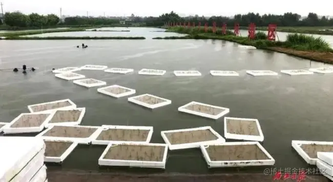 浮床采用高分子复合材料做成,每个长2.2米、宽1.5米,工人将塘泥倒入、铺平,接着注入塘水,再插上育好的秧苗。完成插秧后,工人便将浮床推入鱼塘里,用绳子相互串在一起,并固定在塘基上。每块浮床上还装灭虫灯,虫子掉入鱼塘后,成为鱼儿口中美食。