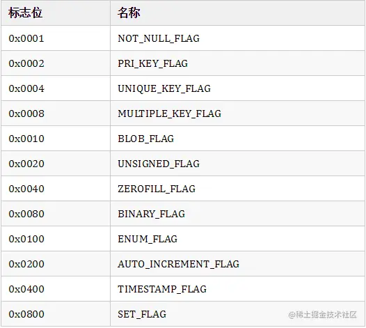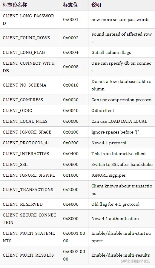 服务器功能标志:用于与客户端协商通讯方式,各标志位含义如下(参考MySQL源代码/include/mysql_com.h中的宏定义):