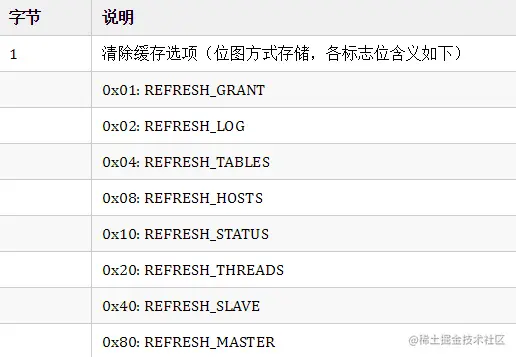 功能:清除缓存,等同于SQL语句FLUSH,或是执行mysqladmin flush-foo命令时发送该消息。
