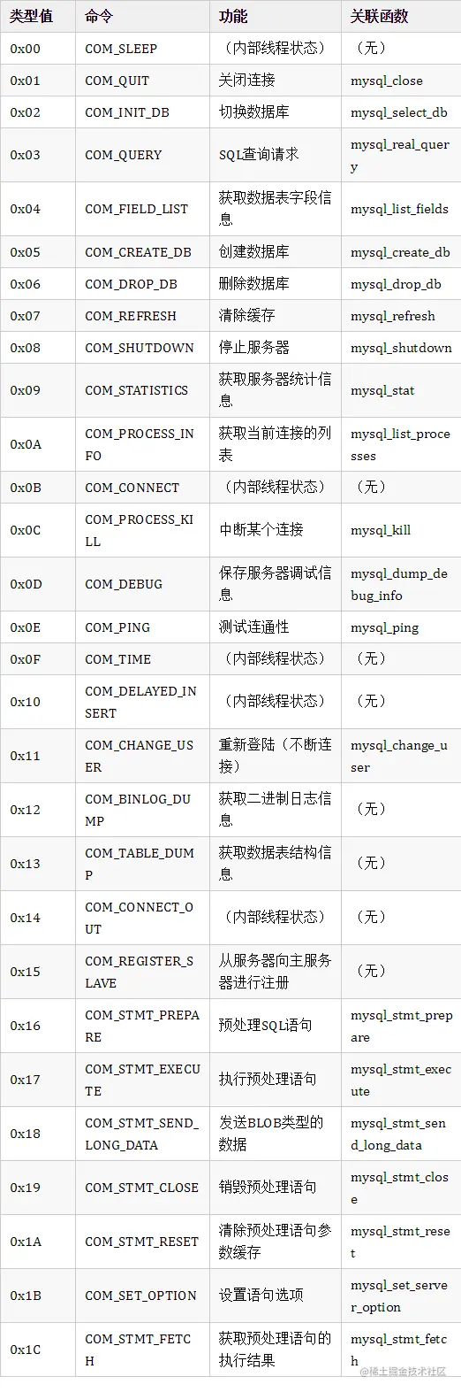 命令:用于标识当前请求消息的类型,例如切换数据库(0x02)、查询命令(0x03)等。命令值的取值范围及说明如下表(参考MySQL源代码/include/mysql_com.h头文件中的定义):