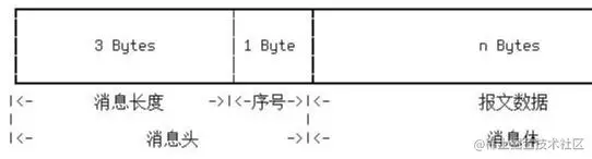 报文分为消息头和消息体两部分,其中消息头占用固定的4个字节,消息体长度由消息头中的长度字段决定,报文结构如下: