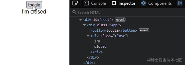 如前所述,更新组件状态会重新渲染组件。然而,如下所示,在每次重新渲染时,React 只知道更新类名和更改的文本。