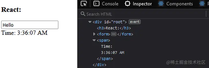浏览器 DOM 没有机制来比较和对比已经更改的内容,只重绘 DOM 节点(在本例中是渲染时间):