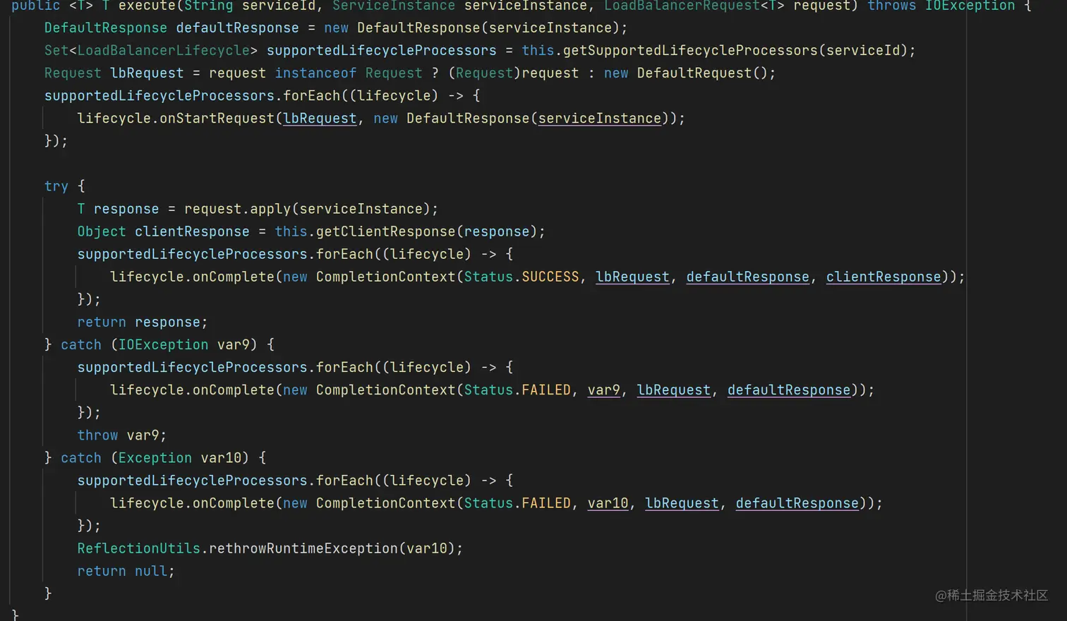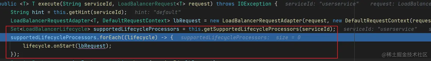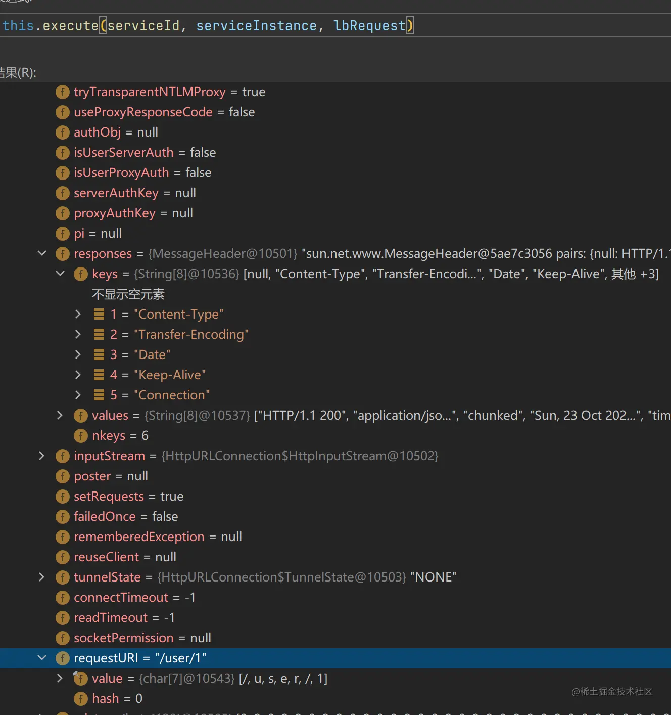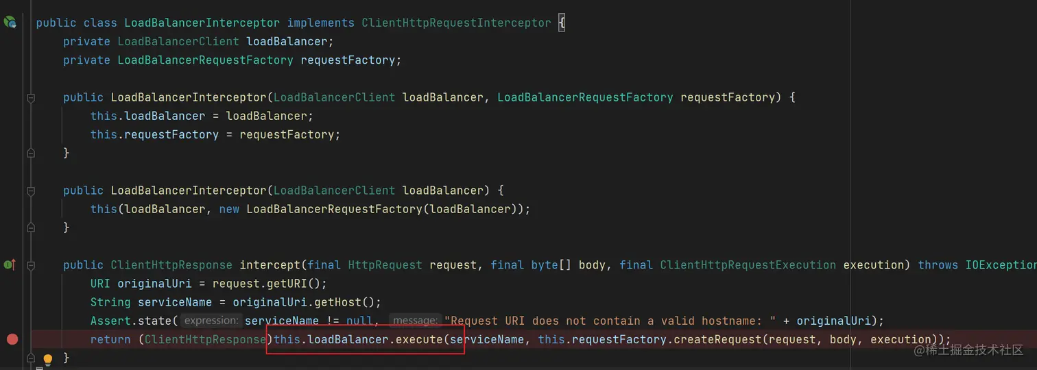 LoadBalancerInterceptor拦截服务调用请求后,会获取 Uri 和 serviceName 作为 this.loadBalancer.execute() 的参数,然后执行 execute方法。