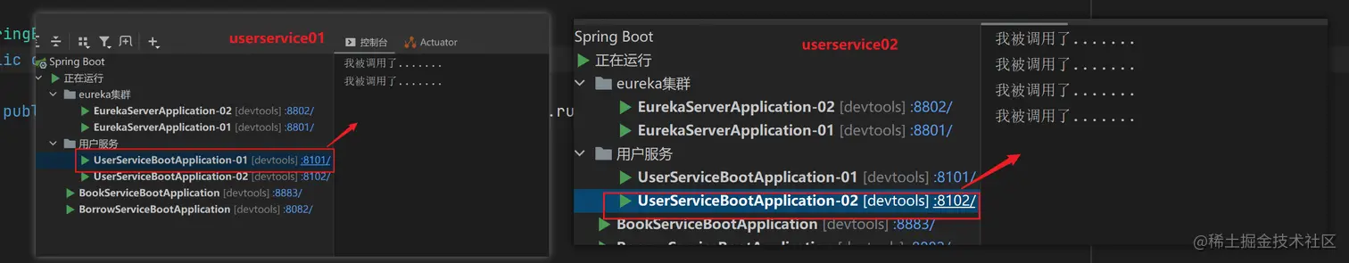 我们发现 userservice01 被调用两次,userservice02 被调用四次,证明是随机的。而默认的轮询策略则是各三次。