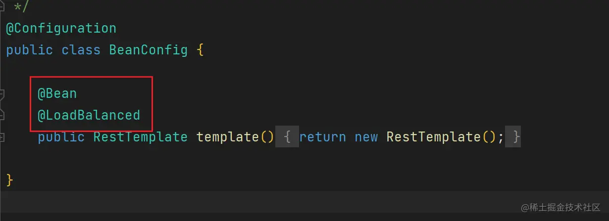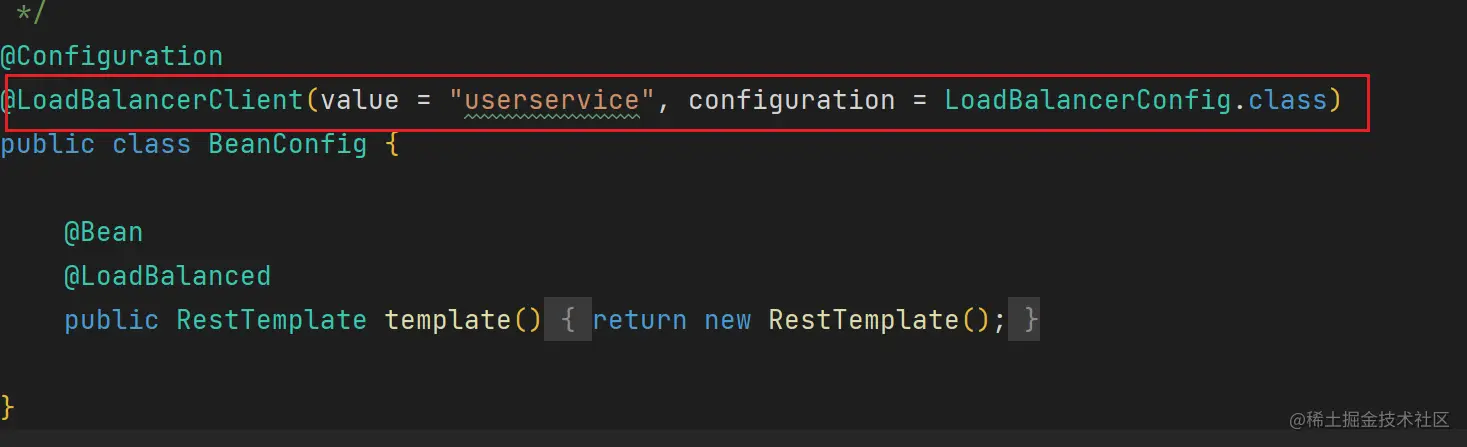 然后我们需要为对应的服务指定负载均衡策略,配置在 template 对象的配置类中: