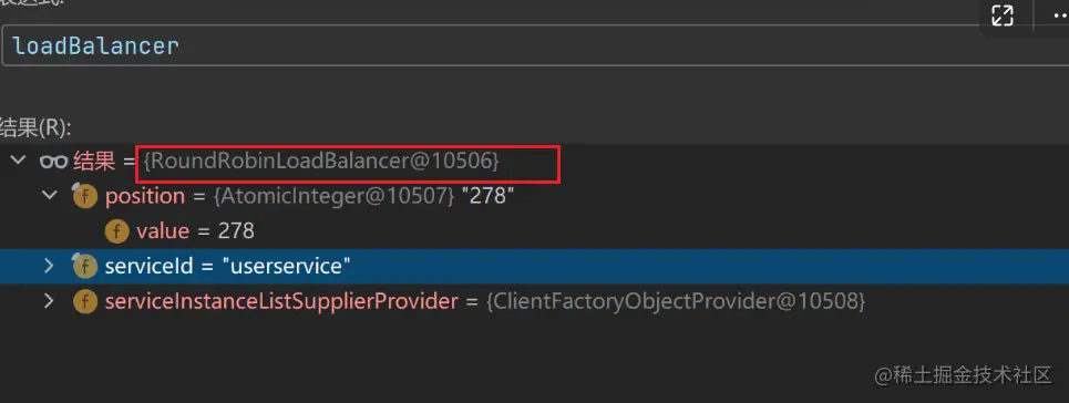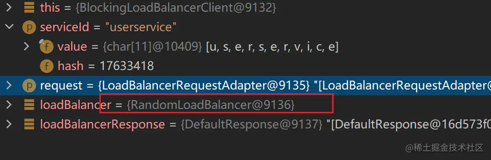 然后通过 loadBalancerClientFactory 负载均衡客户端工厂的 getInstance 方法,获取 loadBalancer 负载均衡器,也就是负载均衡策略,默认为 RoundRobinLoadBalancer(轮询分配策略,每个微服务实例依次获取请求),还有 RandomLoadBalancer(随机分配策略,每个微服务实例随机获取请求)。