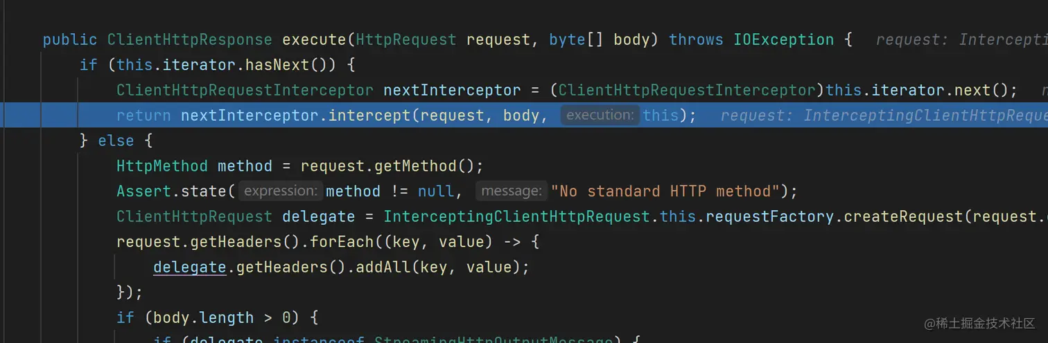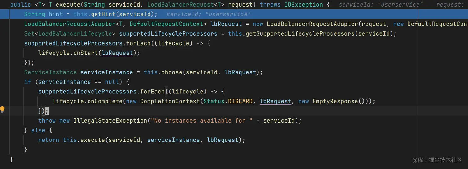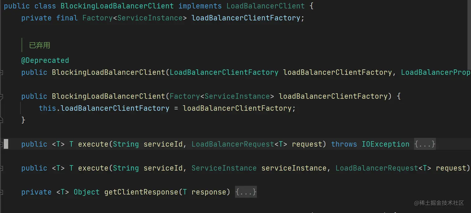 我们点击步入,进入 BlockingLoadBalancerClient的 execute(String serviceId, LoadBalancerRequest<T> request)方法: