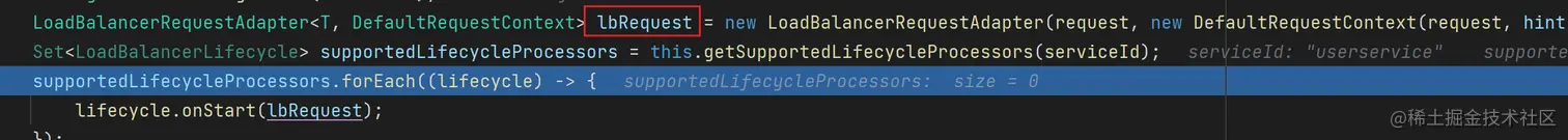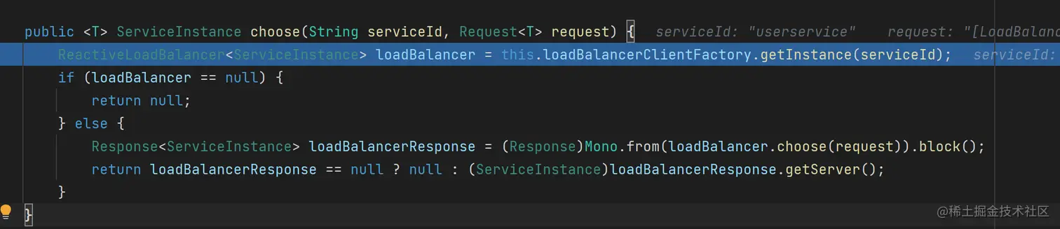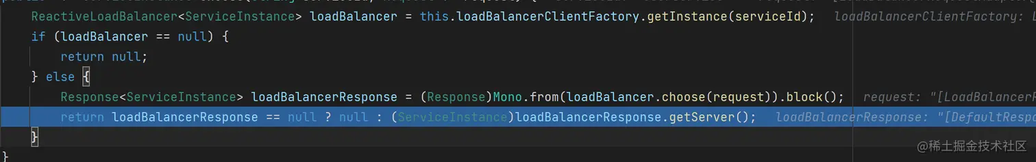 BlockingLoadBalancerClient中的choose方法添加断点,观察是否采用我们指定的策略进行请求: