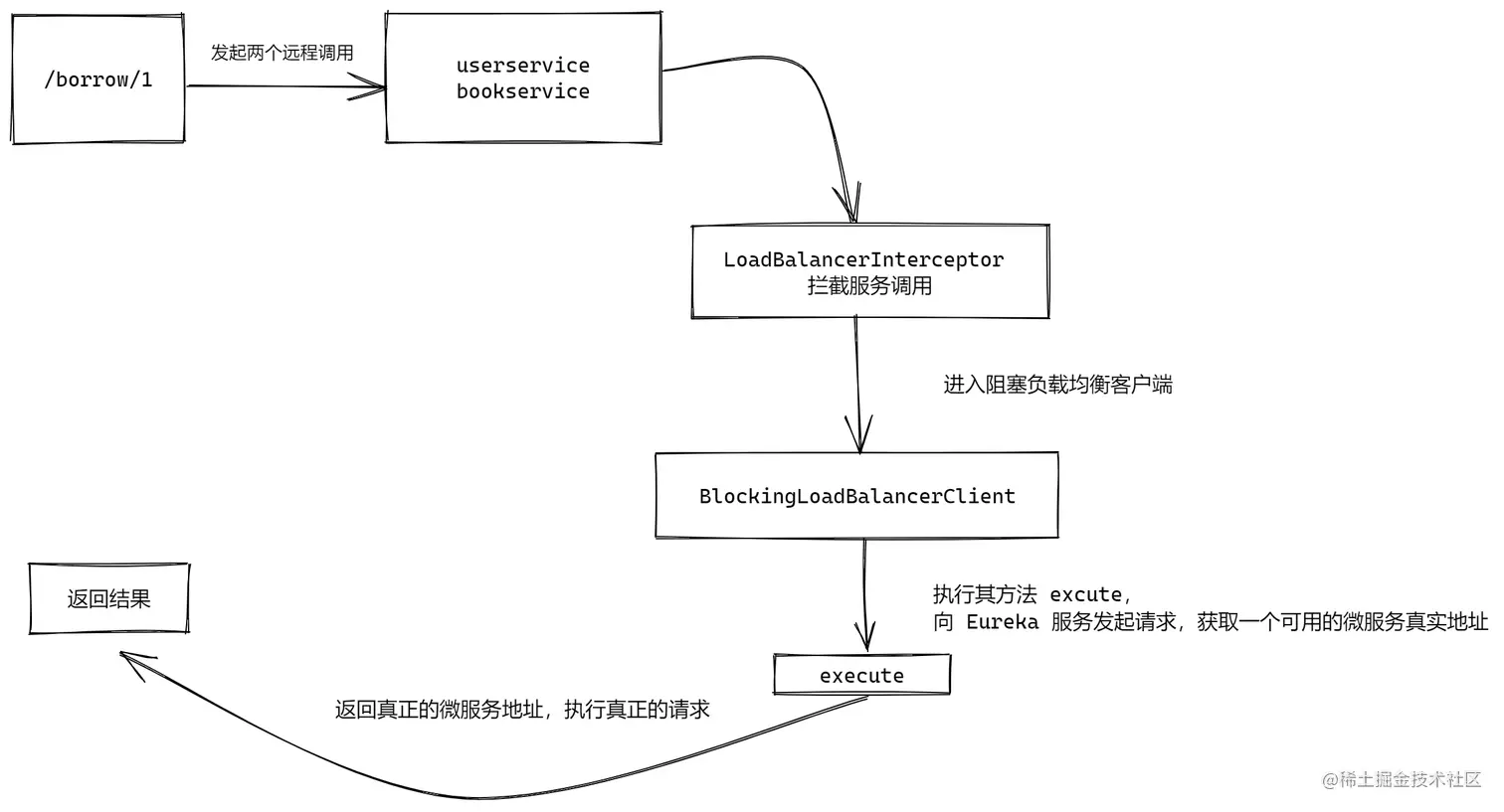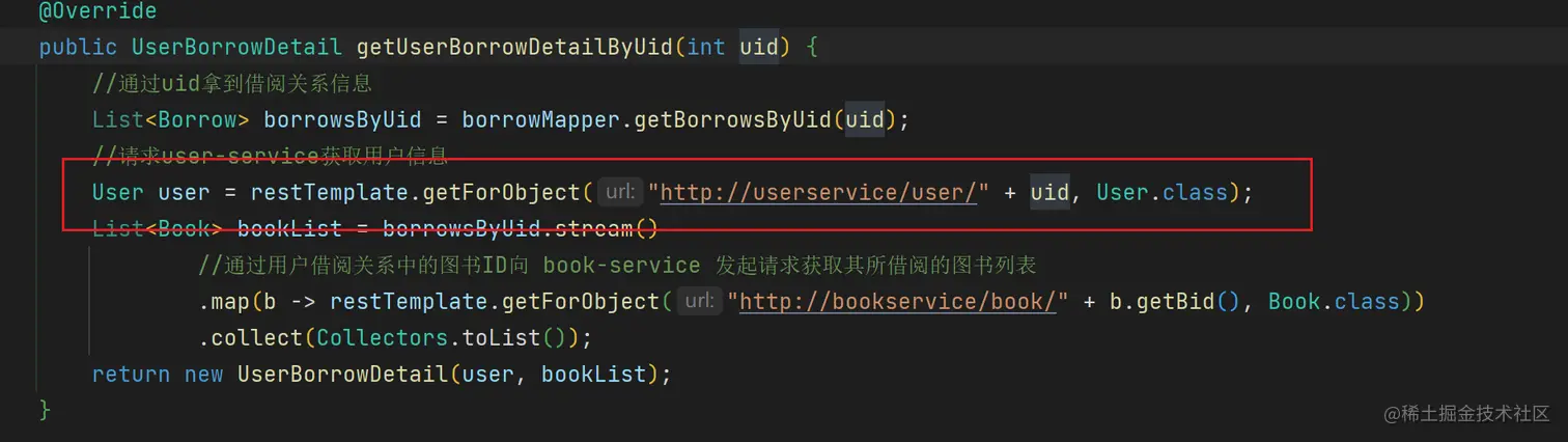 然后我们进行断点调试,查看一下具体的执行流程:假设发起请求 /borrow/1 获取用户1的借阅详细信息,那么会对 userservice 和 bookservice 发起服务调用。我们就看一下对 userservice 远程调用的执行过程吧。