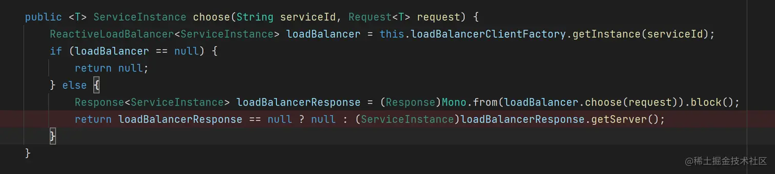 我们点进去这个方法,会转到 LoadBalancerClient接口,然后我们 Alt+Enter 进入该接口的实现:BlockingLoadBalancerClient