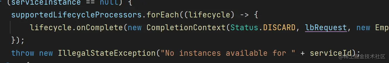 如果serviceInstance 对象为空,则报错提示没有对应的微服务,服务调用失败。