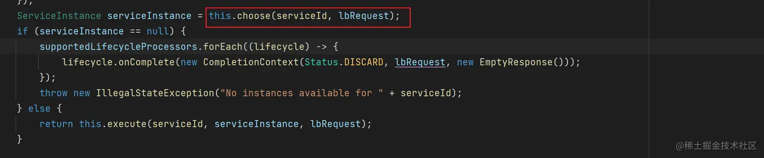 然后通过调用 this.choose(serviceId, lbRequest) 通过服务名称和负载均衡适配器自动选择对应的服务实例信息。