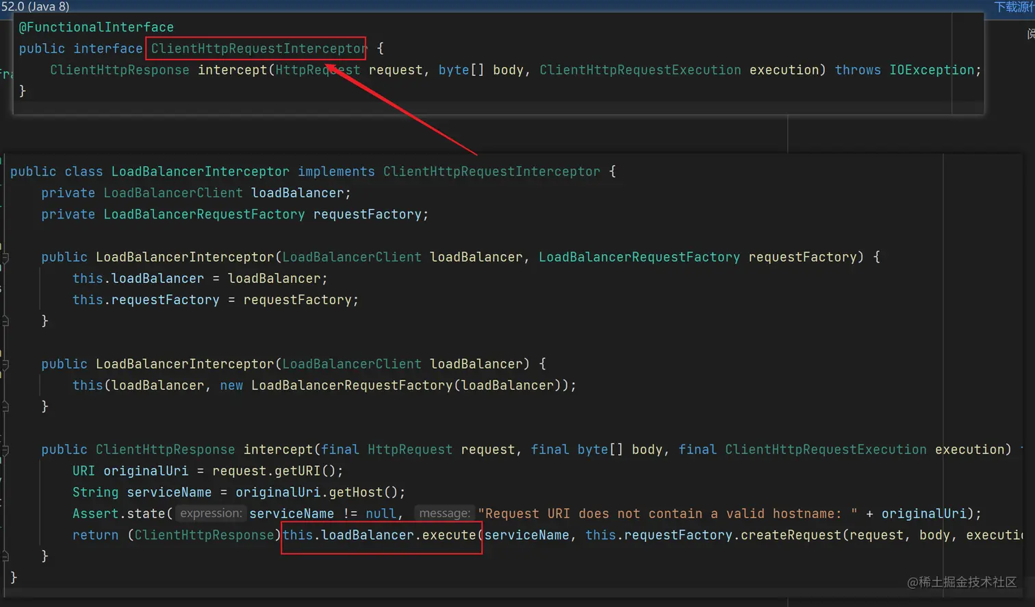 通过 LoadBalancerInterceptor拦截器进行拦截,实现自 ClientHttpRequestInterceptor 接口: