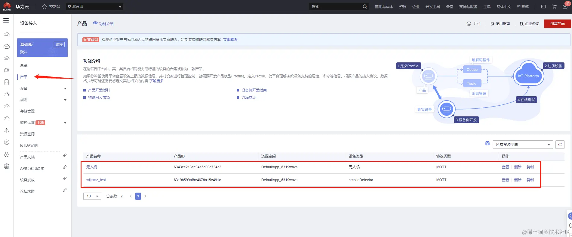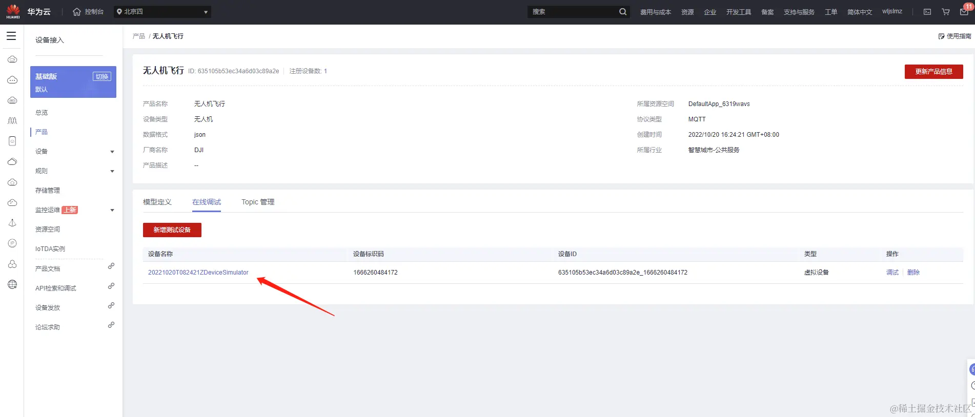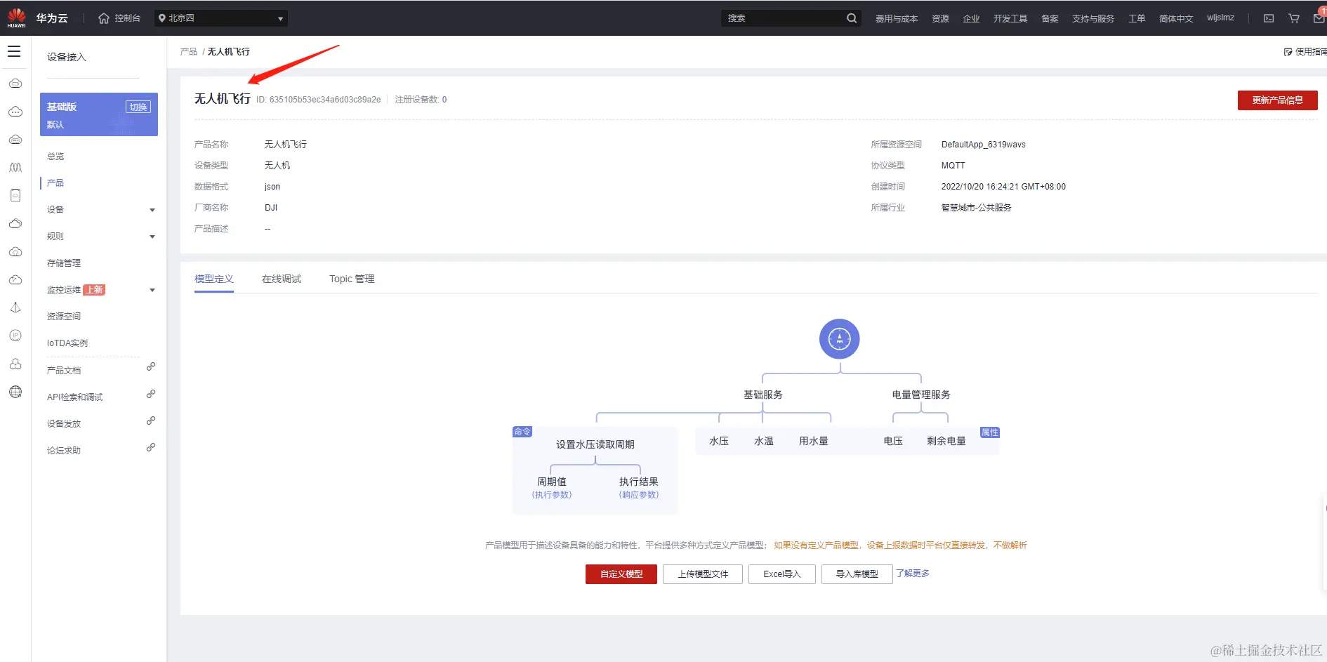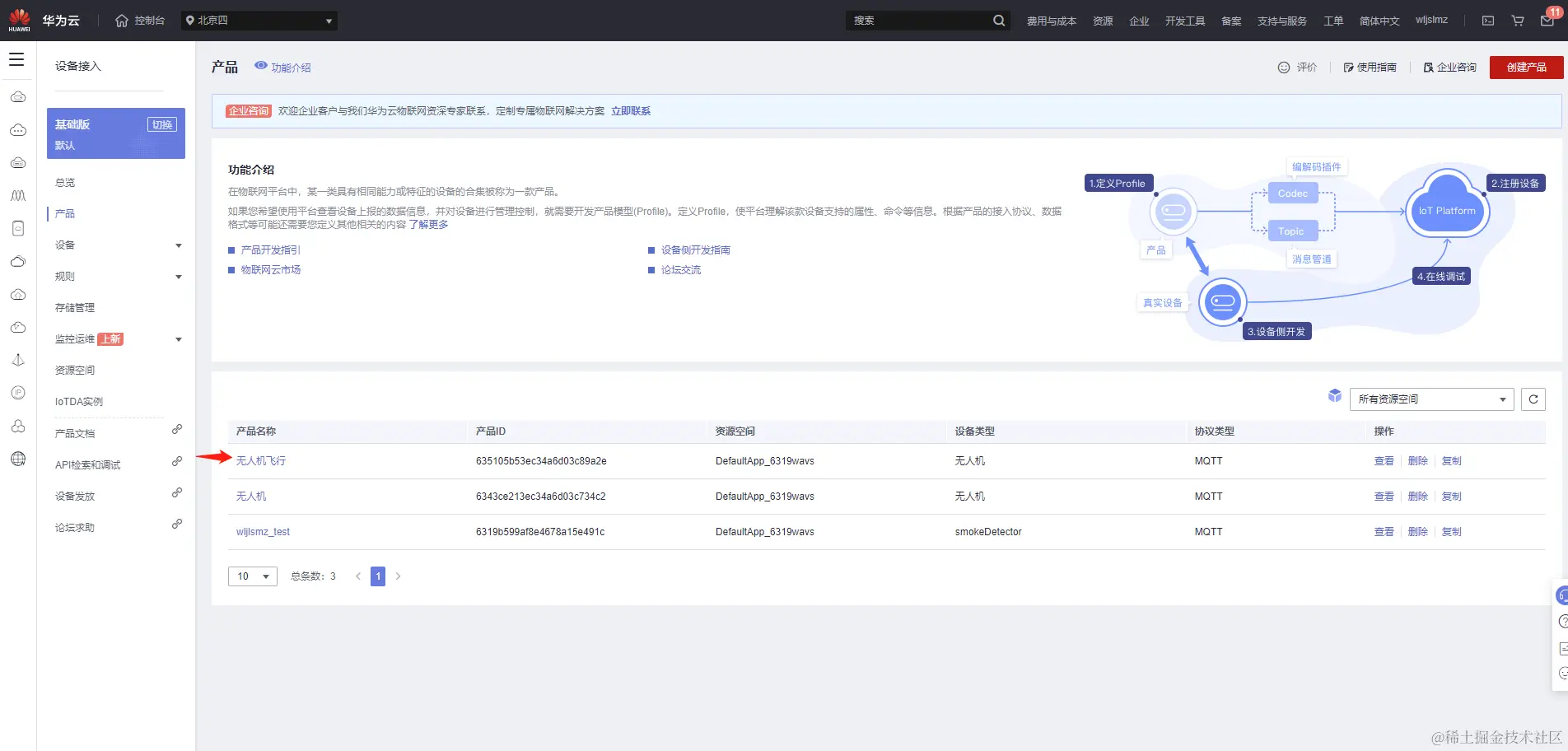 我们看到已经有两个产品,其中无人机的产品是之前创建的,这里我们重新创建一个无人机的产品用来测试无人机的飞行数据。