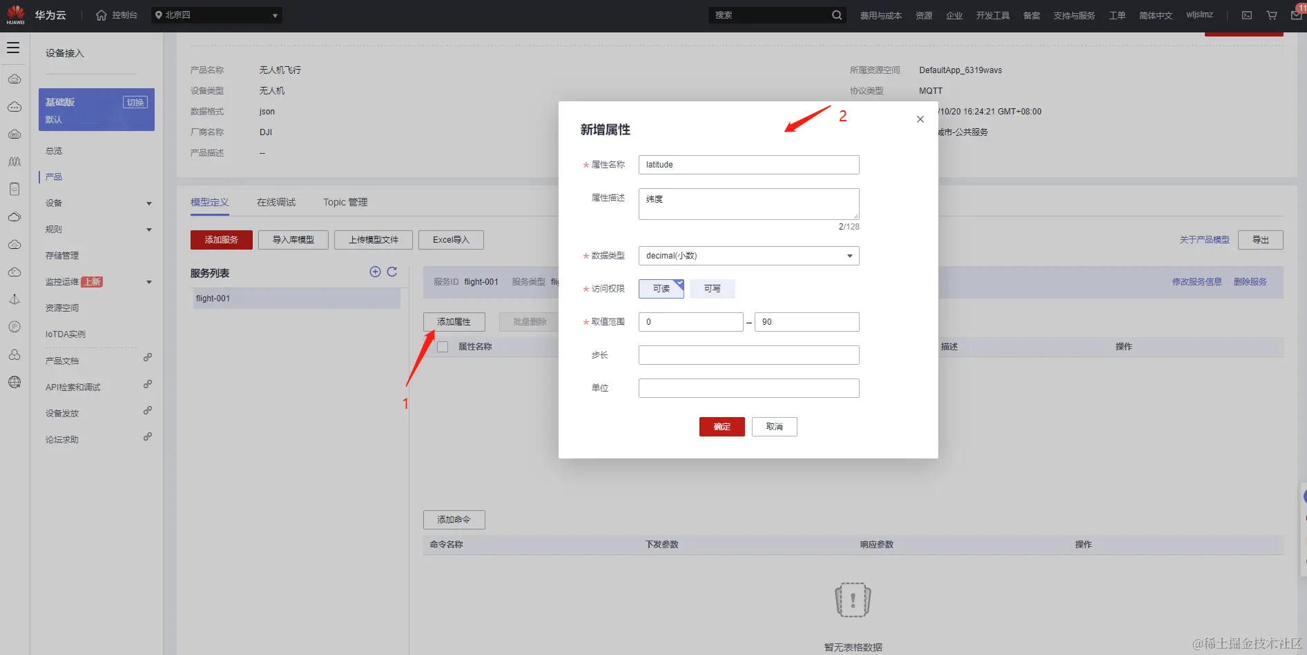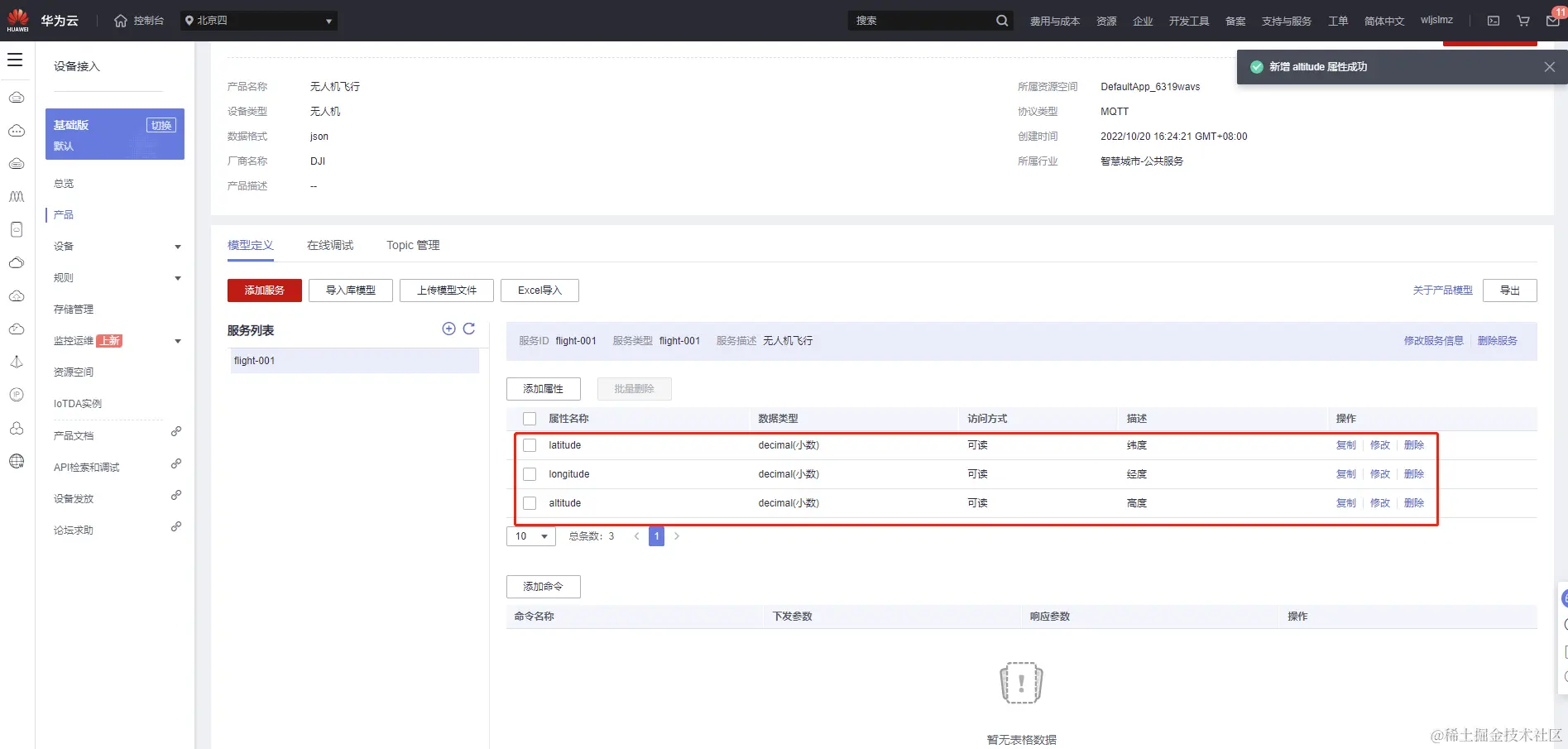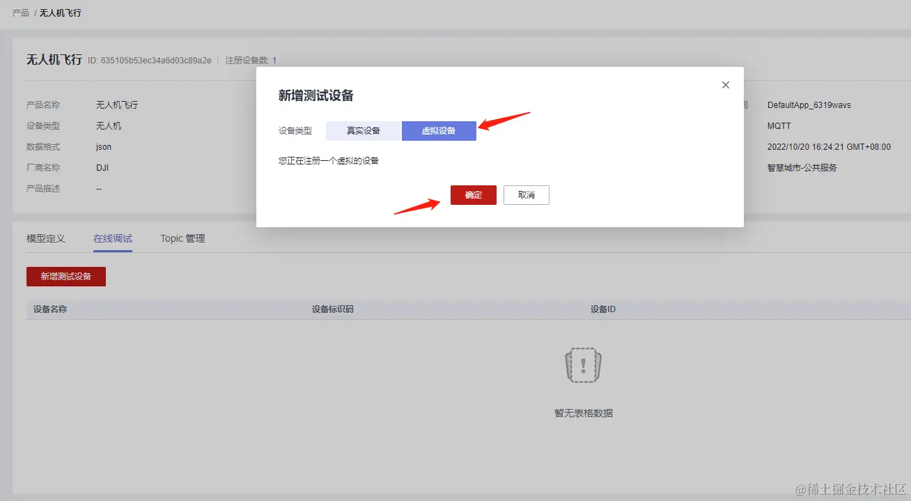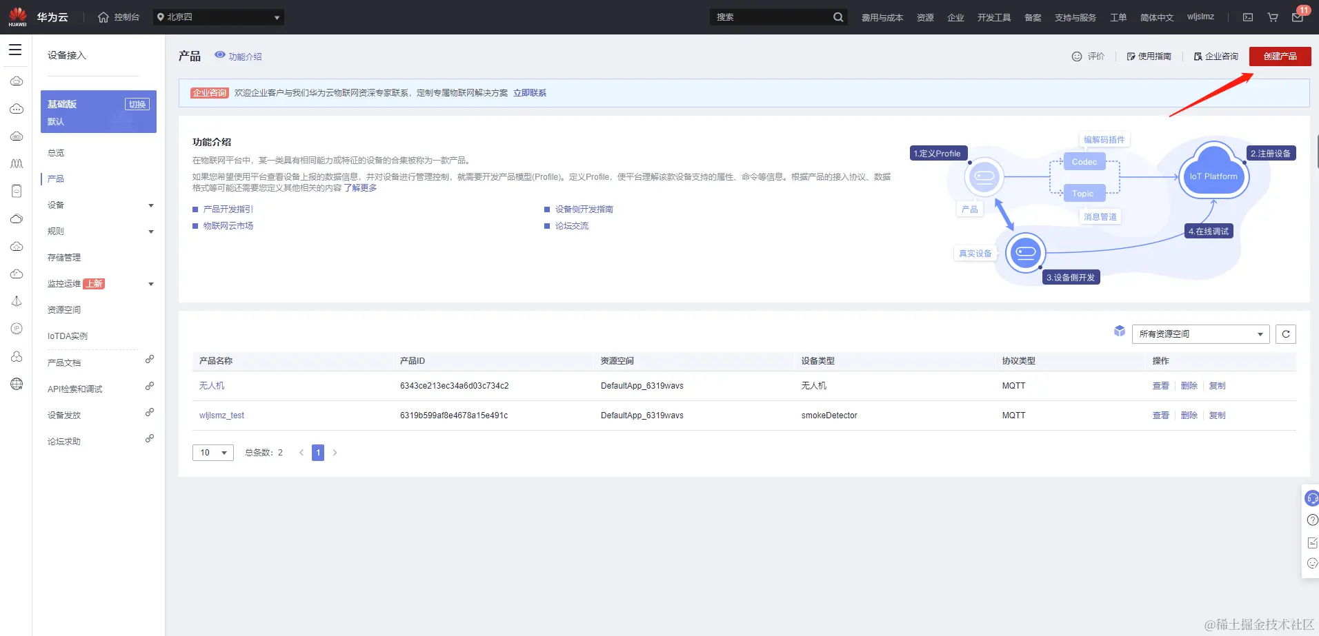 我们看到已经有两个产品,其中无人机的产品是之前创建的,这里我们重新创建一个无人机的产品用来测试无人机的飞行数据。