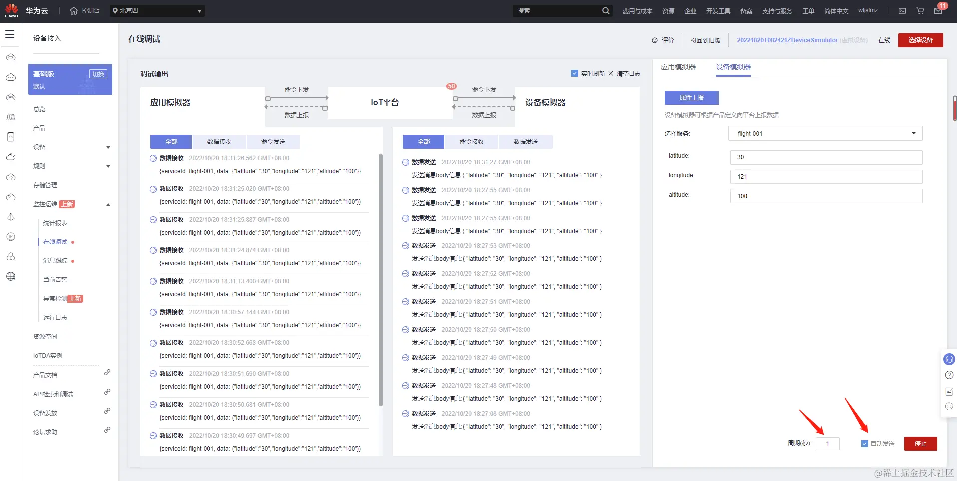 我们多发一些数据,属性上报这里选择自动发送,周期为1秒: