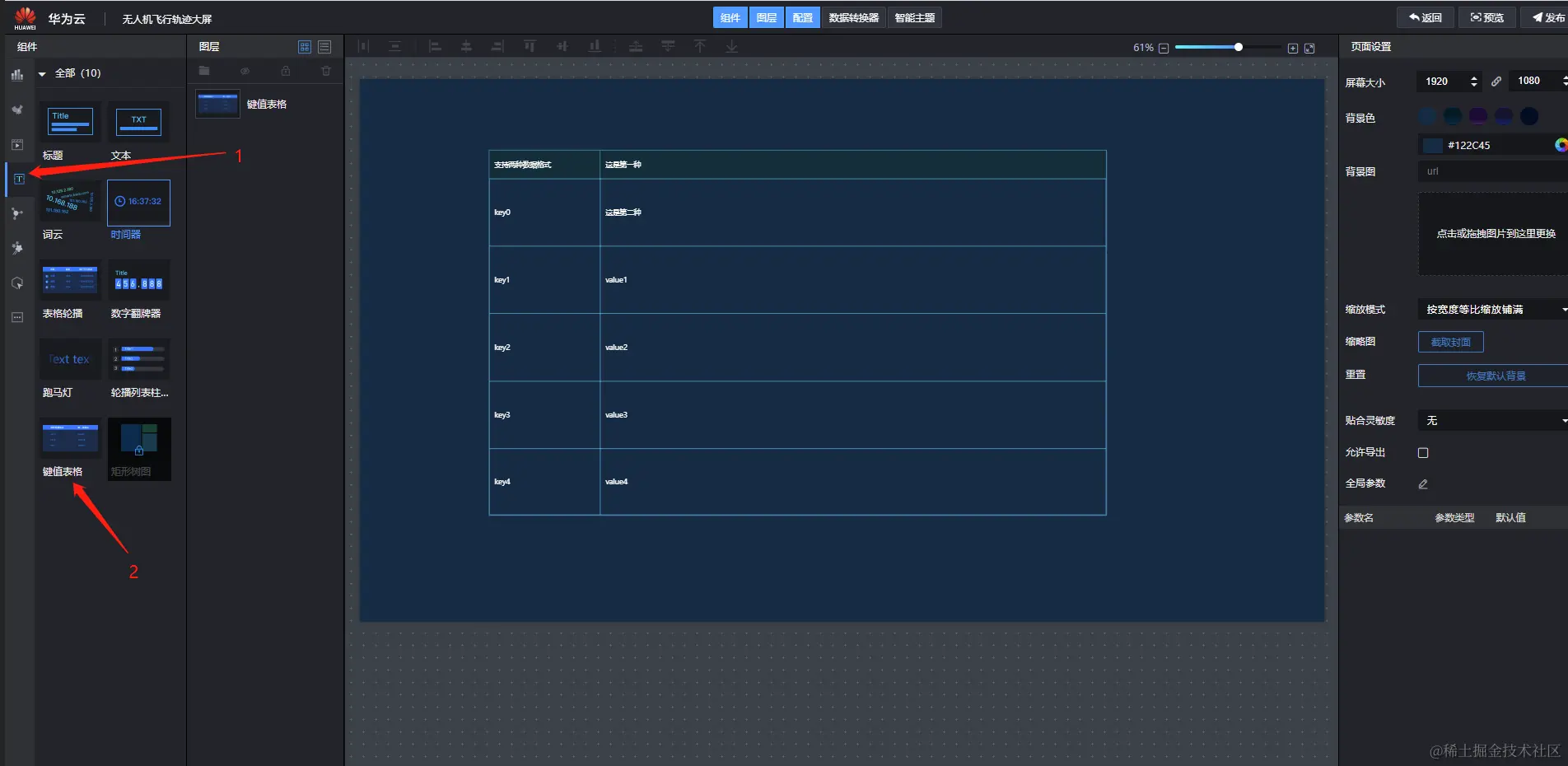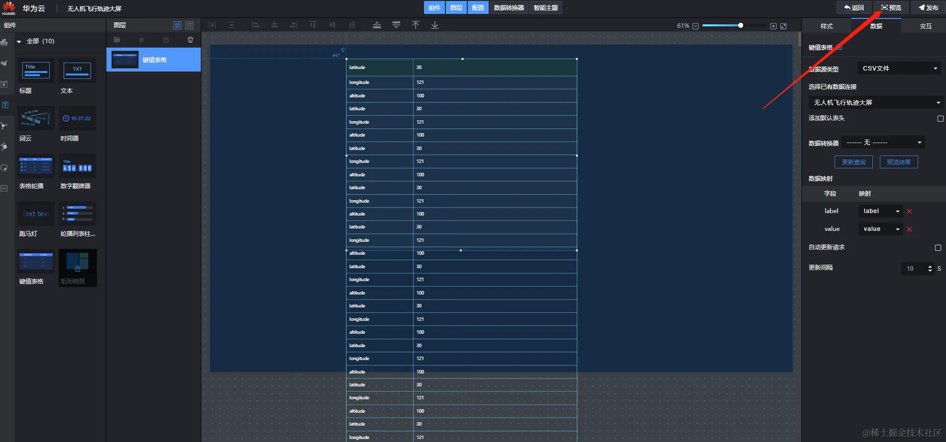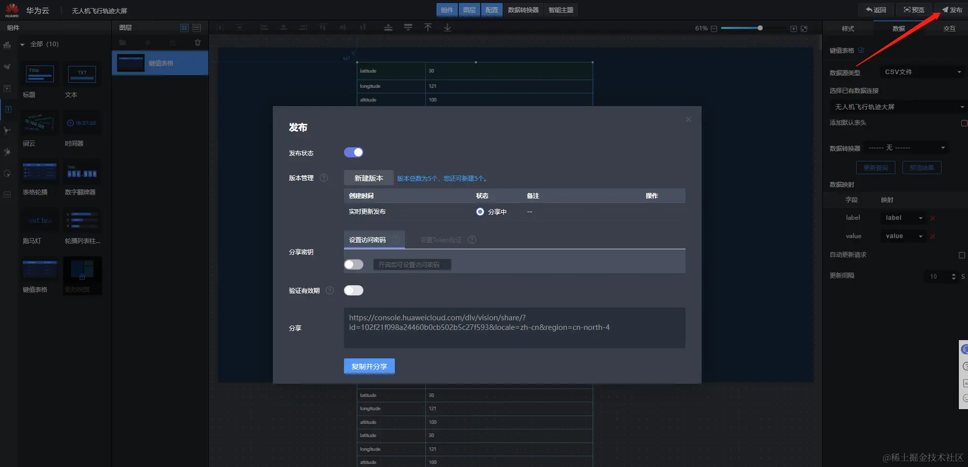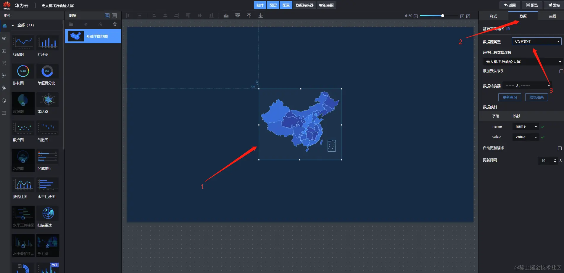 花了2天时间体验了华为的设备接入平台、OBS和可视化服务DLV,原本想将我工作时候的无人机飞行轨迹数据展示出来,但是由于行业的小众加上技术的难度,华为云暂时没有我想要的模板,不过最终我把数据展示出来了,有数据展示就相当于成功了,轨迹图无非就是通过代码的形式将数据绘制出来。如果你的需求场景是态势感知、数据可视化展示等,我觉得你可以试用一下这个智慧大屏,操作比较简单,生成后访问速度也还可以。本文展示的教程真的是教科书级别的,非常详细,每做一步都有截图,如果你在使用的过程中遇到问题,可以参考本文。如果本文对你真的有所帮助,请收藏或者帮忙转发一下,有任何问题,欢迎在下方评论区与我讨论。