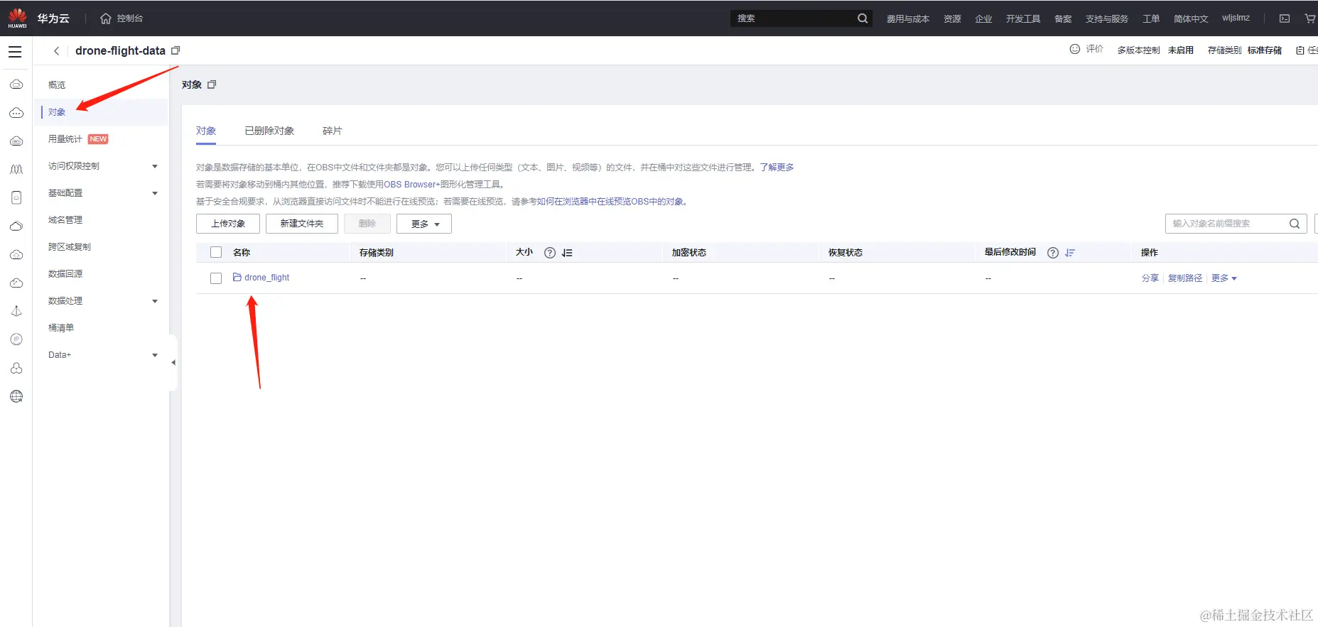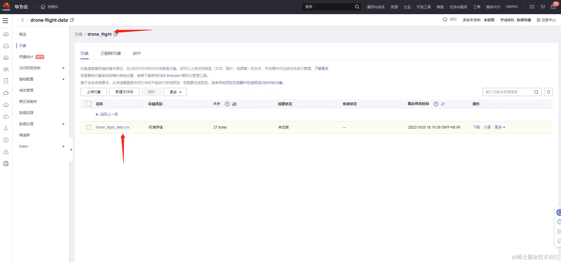 桶列表中就看到了我们刚刚创建的桶drone-flight-data: