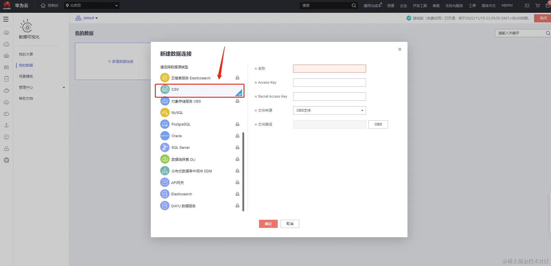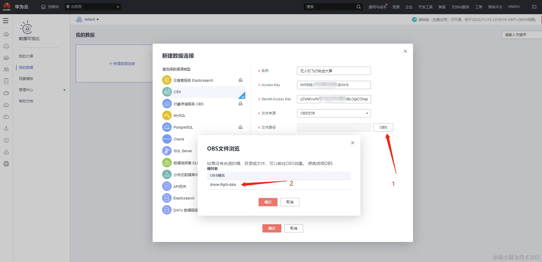 首先我们就把数据存储的地方选好,这里我们选择的是华为云的OBS。