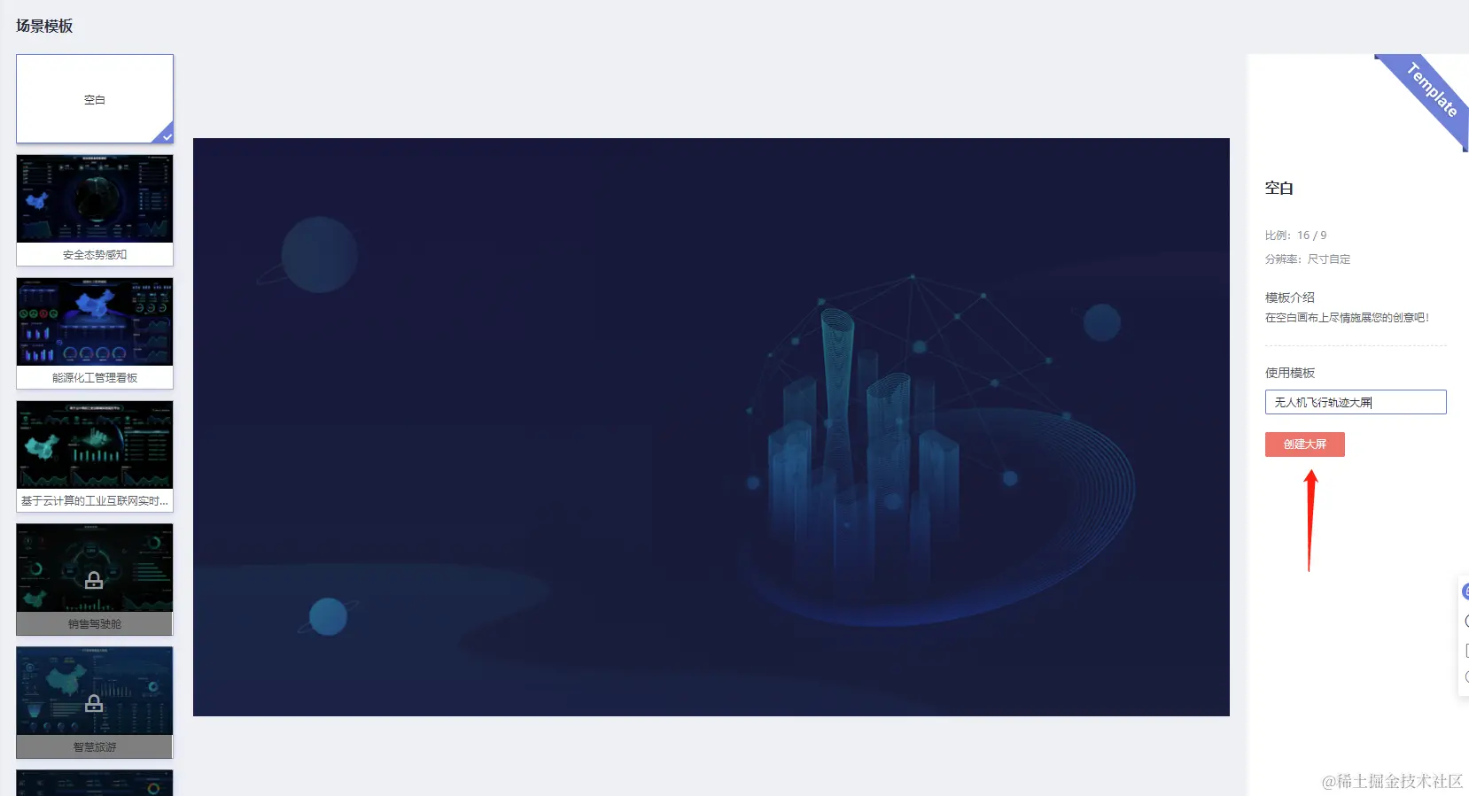 所以我们直接创建空白的模板,起个名字:无人机飞行轨迹大屏,点击【创建大屏】:
