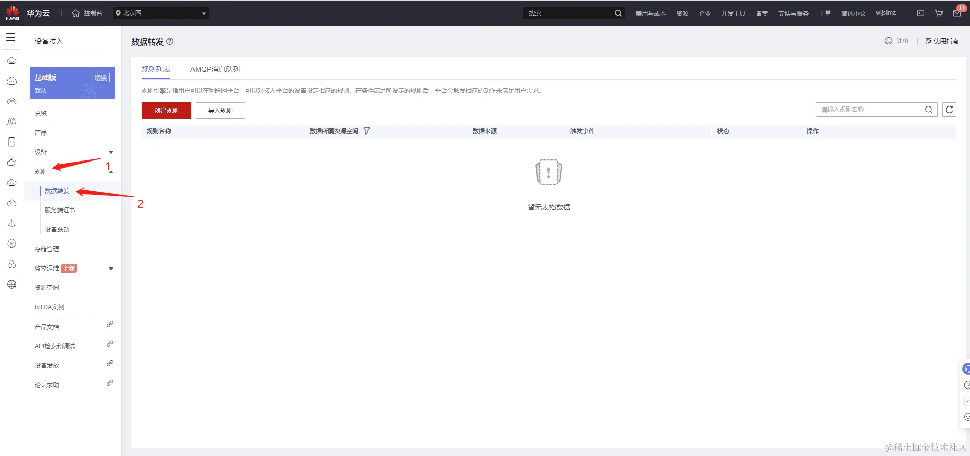 在”设备接入“界面,点击【规则】,点击【数据转发】: