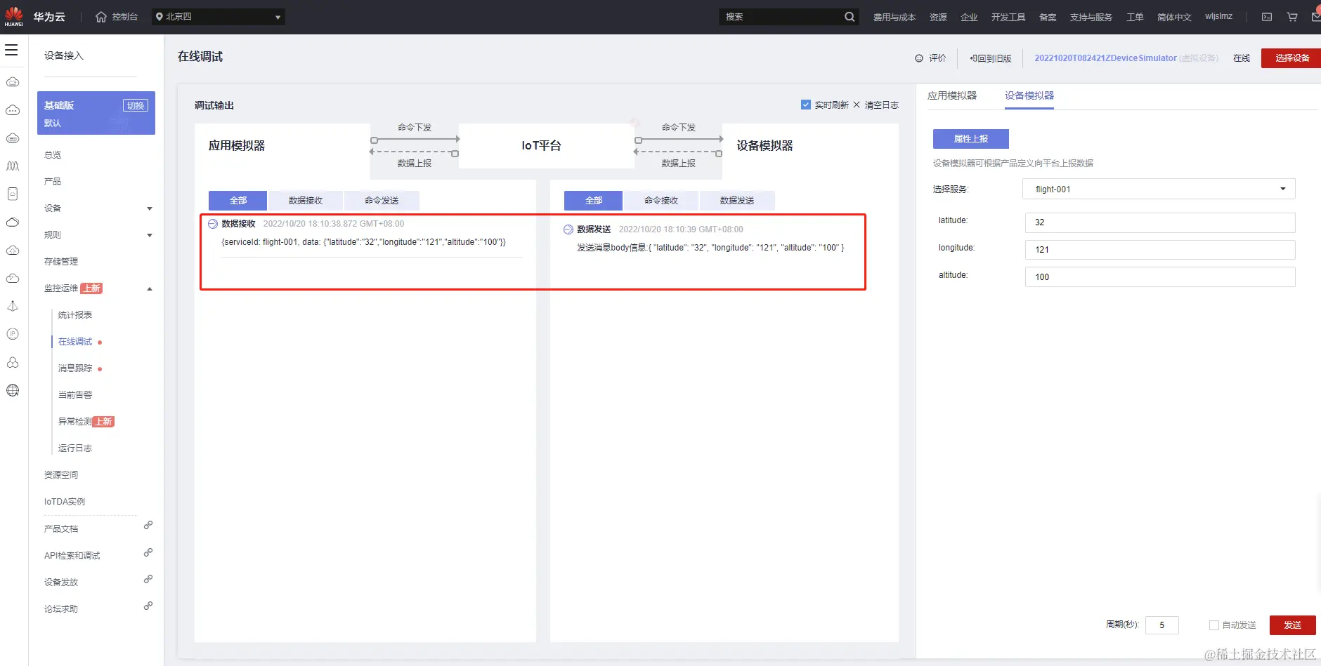 发送后,我们清晰的看到无人机上报的信息,以及应用模拟器接收到的信息: