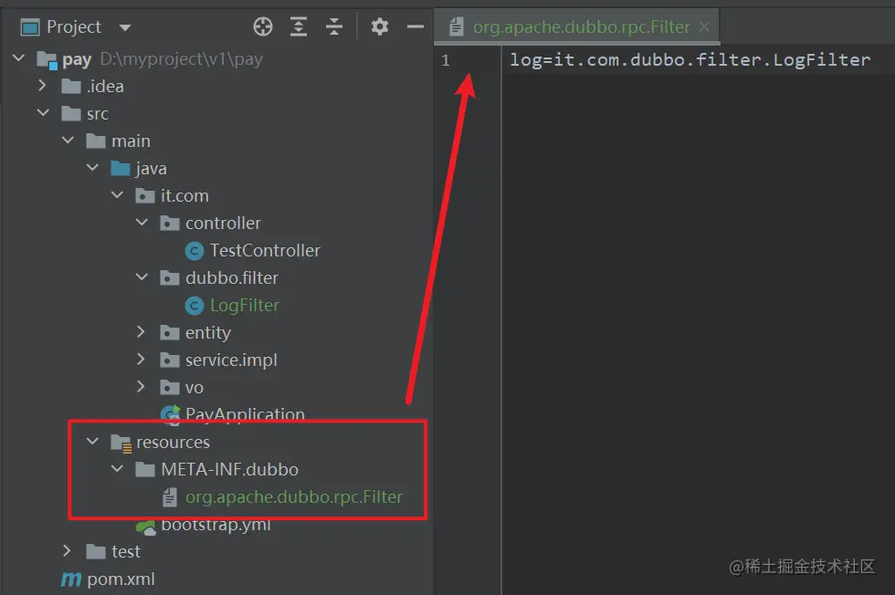 在项目的resources下创建META-INF/dubbo文件夹,然后新建名为org.apache.dubbo.rpc.Filter的文件,就是个普通的 txt 文件,然后在文件内容中编写如下: